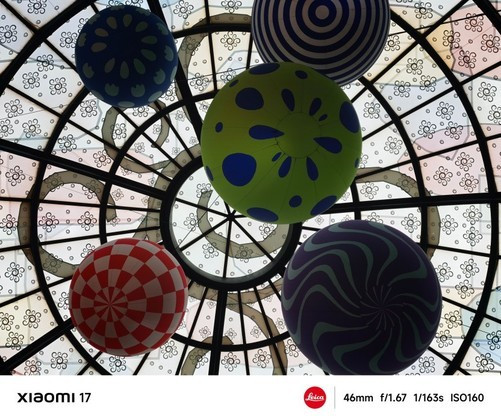 在46mm焦段,即使是阴天的半室内拍摄,画面整体清晰度高,彩色气球的图案、纹理以及穹顶的花纹等细节都能清晰呈现,小米17的镜头在捕捉细节方面表现出色,让画面富有层次感。13.5EV的原生动态范围,让逆光场景下也不至于过曝或死黑。