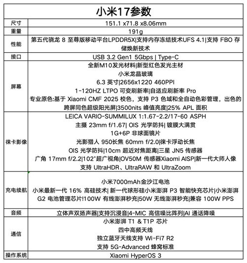 小米17就是这段探索的最新成果:1.18mm极窄边框带来的沉浸视觉、7000mAh电池与100W快充的续航、第五代骁龙8至尊版的性能释放,以及徕卡三摄的全面进化。它不仅回答了“小屏还能否做旗舰”的问题,更试图定义一种新的旗舰形态——小而全能。